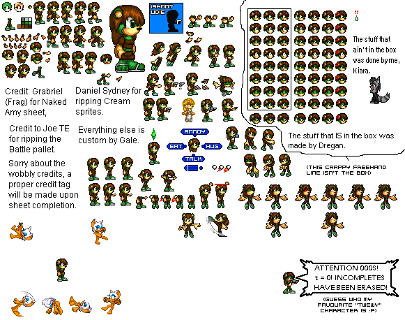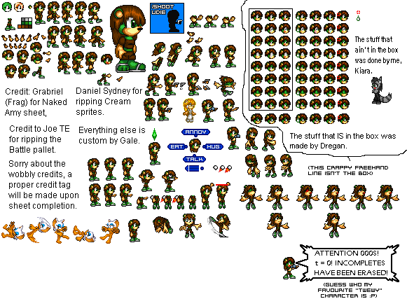 It's true, I timed it. It took 25 minutes, which is my estimate for how long it normally takes per pose. New pose again! Gale, floating and looking lifeless. Shrank the sheet a little. Once I'm done with the poses I took from Rouge, I'll organise the sheet - however, unlike it says in the credits, this does not signify sheet completion and I'll probably make more sprites. I want to give her a special ability so I can make some custom poses, but it needs to be interesting, original and suiting to her personality (which I haven't actually defined yet). I'm open for suggestions... ;3 |